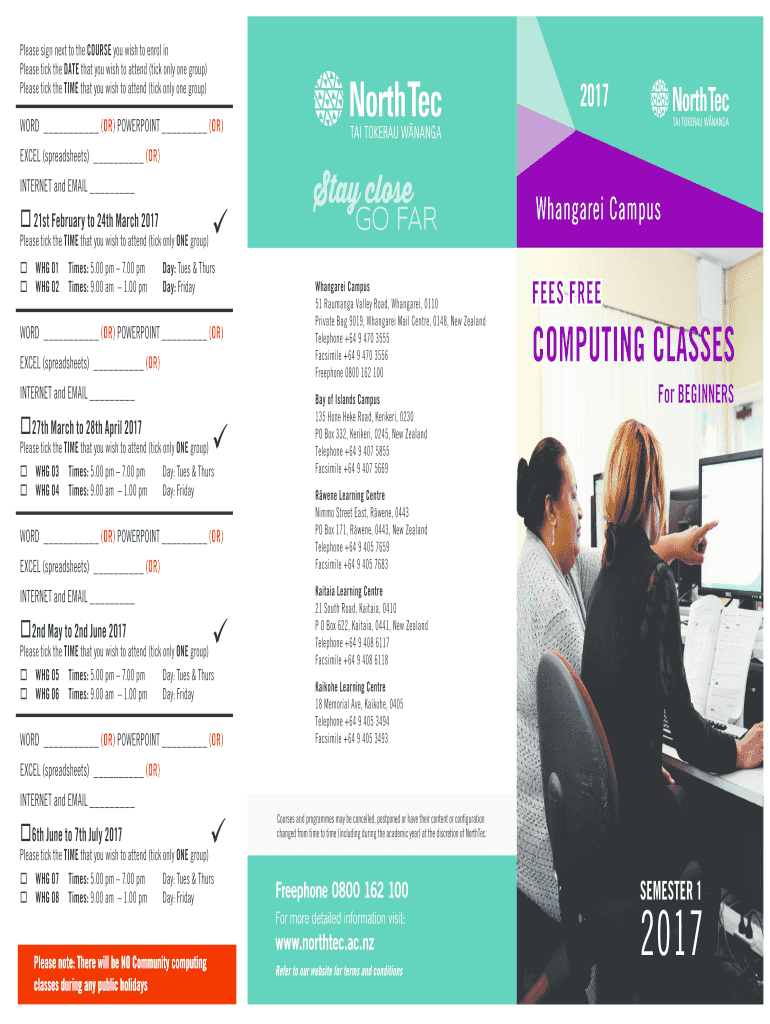 00 pm 7. 00 pm WHG 02 Times 9. 00 am 1. 00 pm Day Tues Thurs Day Friday 27th March to 28th April 2017 2nd May to 2nd June 2017 Stay close GO FAR Whangarei Campus 51 Raumanga Valley Road Whangarei 0110 Private Bag 9019 Whangarei Mail Centre 0148 New Zealand Telephone 64 9 470 3555 Facsimile 64 9 470 3556 Freephone 0800 162 100 Bay of Islands Campus 135 Hone Heke Road Kerikeri 0230 PO Box 332 Kerikeri 0245 New Zealand FEES FREE COMPUTING CLASSES For BEGINNERS R wene Learning Centre Nimmo...