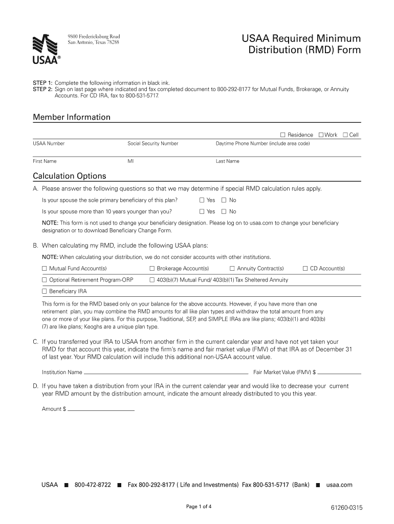 9800 Fredericksburg Road San Antonio Texas 78288 USAA Required Minimum Distribution RMD Guide USAA means USAA Federal Savings Bank USAA Investment Management Company USAA Life Insurance Company and USAA Life Insurance Company of New York. 1. I would like to receive my distributions Monthly Quarterly - check one month below and the RMD will occur every 3 months starting that month Semiannually - check one month below and the RMD will occur every 6 months starting that month Annually - check...