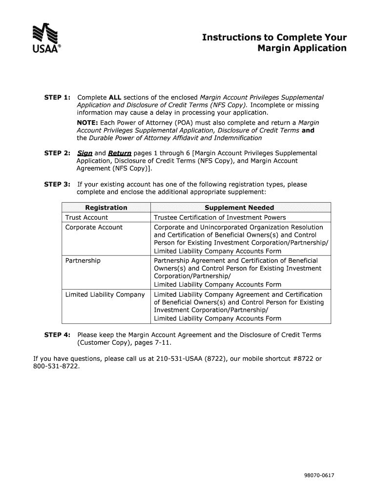 Firm Address City State Zip Code Margin credit is extended by National Financial Services LLC Member NYSE SIPC 1-800-531-USAA 8722 m Fax 1-800-292-8177 m usaa.com 1. X 1. ACCOUNT HOLDER/TRUSTEE DATE mm/dd/yyyy 2. J OINT ACCOUNT HOLDER/CO-TRUSTEE/AUTHORIZED INDIVIDUAL SIGNATURE IF ANY DATE mm/dd/yyyy National Financial Services LLC Member NYSE SIPC 1. NFS may also take action to sell securities or other assets in your accounts held with NFS and certain NFS affiliates. No provision of this...