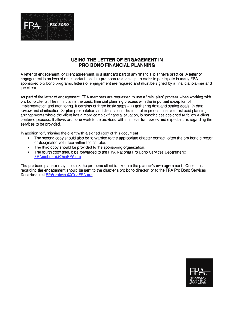 The third copy should be provided to the sponsoring organization. The fourth copy should be forwarded to the FPA National Pro Bono Services Department FPAprobono OneFPA. Org The pro bono planner may also ask the pro bono client to execute the planner s own agreement. Questions regarding the engagement should be sent to the chapter s pro bono director or to the FPA Pro Bono Services Department at FPAprobono OneFPA. See also 11. undersigned planner is bound by the Financial Planning...