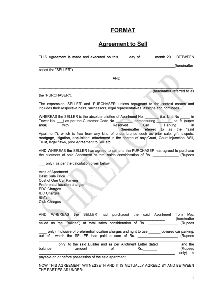 FORMAT Agreement to Sell THIS Agreement is made and executed on this day of month 20 BETWEEN (hereinafter called the “SELLER “) AND (hereinafter referred to as the “PURCHASER “). The expression