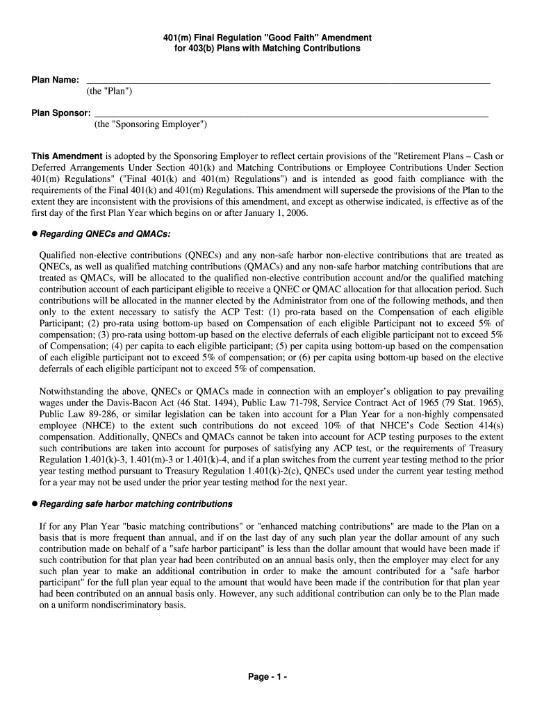 The 401(m) Final Regulation Good Faith Amendment is designed to assist plan sponsors in updating their 403(b) plans to align with the latest Final 401(k) and 401(m) Regulations. This amendment is crucial for ensuring compliance, providing clear guidelines for implementing various contributions such as qualified nonelective contributions (QNECs) and qualified matching contributions (QMACs). Safe harbor matching contributions are also a key aspect of this regulation.