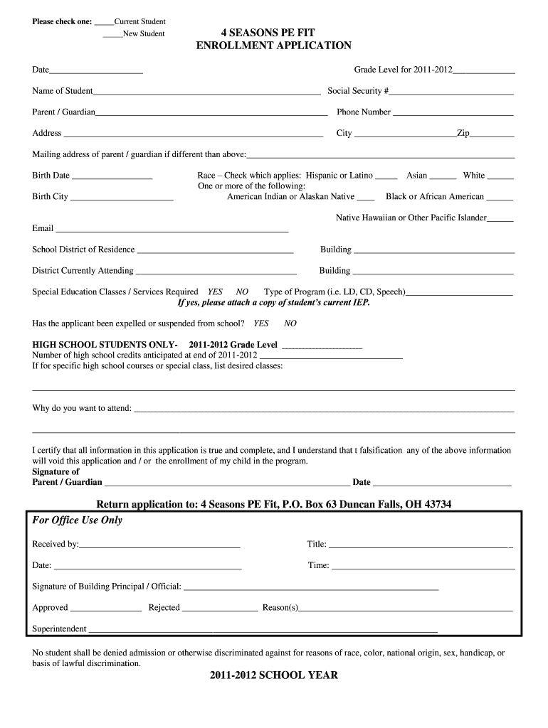 Please check one: Current Student New Student 4 SEASONS PE FIT ENROLLMENT APPLICATION Date Grade Level for 20112012 Names of Student Social Security # Parent / Guardian Phone Number Address City Zip