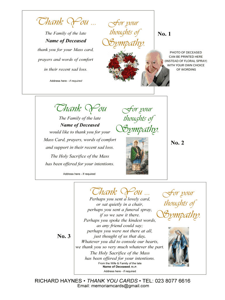 Perhaps you spoke the kindest words as any friend could say perhaps you were not there at all just thought of us that day. Thank You. For your thoughts of The Family of the late Sympathy. Name of Deceased thank you for your Mass card No. 1 PHOTO OF DECEASED CAN BE PRINTED HERE INSTEAD OF FLORAL SPRAY WITH YOUR OWN CHOICE OF WORDING prayers and words of comfort in their recent sad loss. Whatever you did to console our hearts we thank you so very much whatever the part. No. 3 From the Wife...