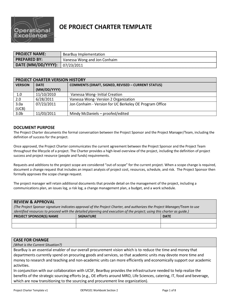 Jon Conhaim The PROJECT STEERING COMMITTEE includes key stakeholders and subject matter experts. Jim Hine UCB UCSF Frank Yeary UCB John Wilton UCB Andrew Szeri UCB-OE Eric Vermillion UCSF John Plotts UCSF A SUBJECT MATTER EXPERT SME provides expertise on project elements including business process and current or new technical solutions. OE PROJECT CHARTER TEMPLATE PROJECT NAME PREPARED BY DATE MM/DD/YYYY BearBuy Implementation Vanessa Wong and Jon Conhaim 07/23/2011 VERSION UCB DATE COMMENTS...