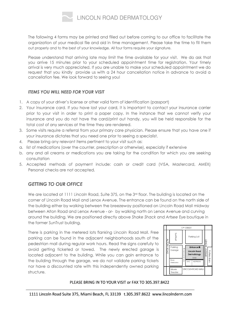 LINCOLN ROAD DERMATOLOGY The following 4 forms may be printed and filled out before coming to our office to facilitate the organization of your medical file and aid in time management. Please take