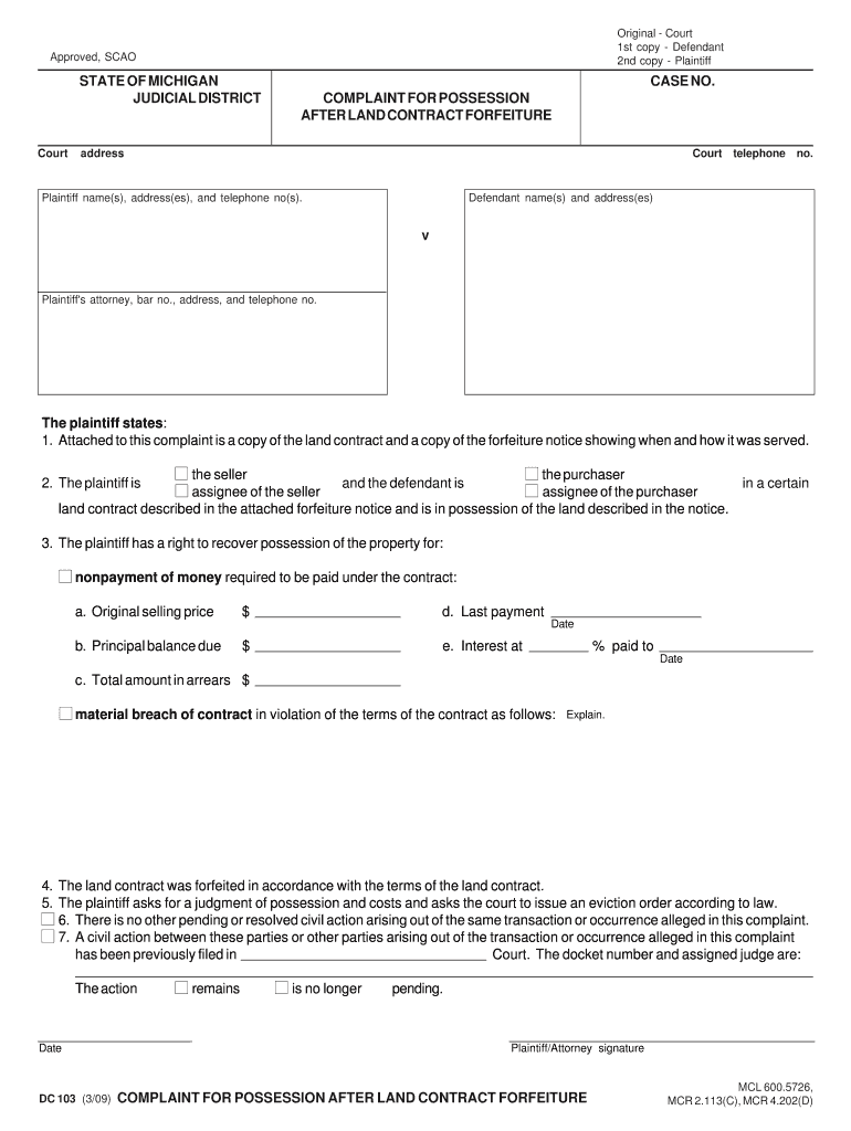 Original - Court 1st copy - Defendant 2nd copy - Plaintiff Approved SCAO STATE OF MICHIGAN JUDICIAL DISTRICT Court CASE NO. The docket number and assigned judge are The action DC 103 3/09 remains is no longer pending. MCL 600. The land contract was forfeited in accordance with the terms of the land contract. 6. There is no other pending or resolved civil action arising out of the same transaction or occurrence alleged in this complaint. 7. A civil action between these parties or other parties...