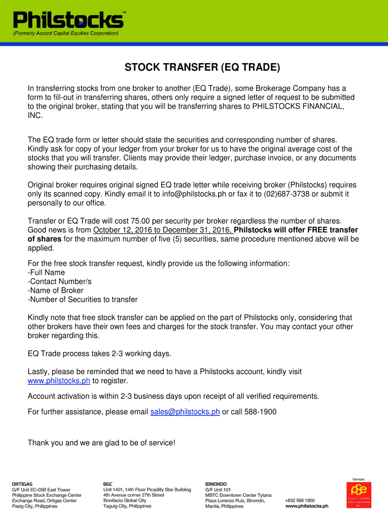 Original broker requires original signed EQ trade letter while receiving broker Philstocks requires only its scanned copy. Clients may provide their ledger purchase invoice or any documents showing their purchasing details. Philstocks. ph to register. Account activation is within 2-3 business days upon receipt of all verified requirements. STOCK TRANSFER EQ TRADE In transferring stocks from one broker to another EQ Trade some Brokerage Company has a form to fill-out in transferring shares...