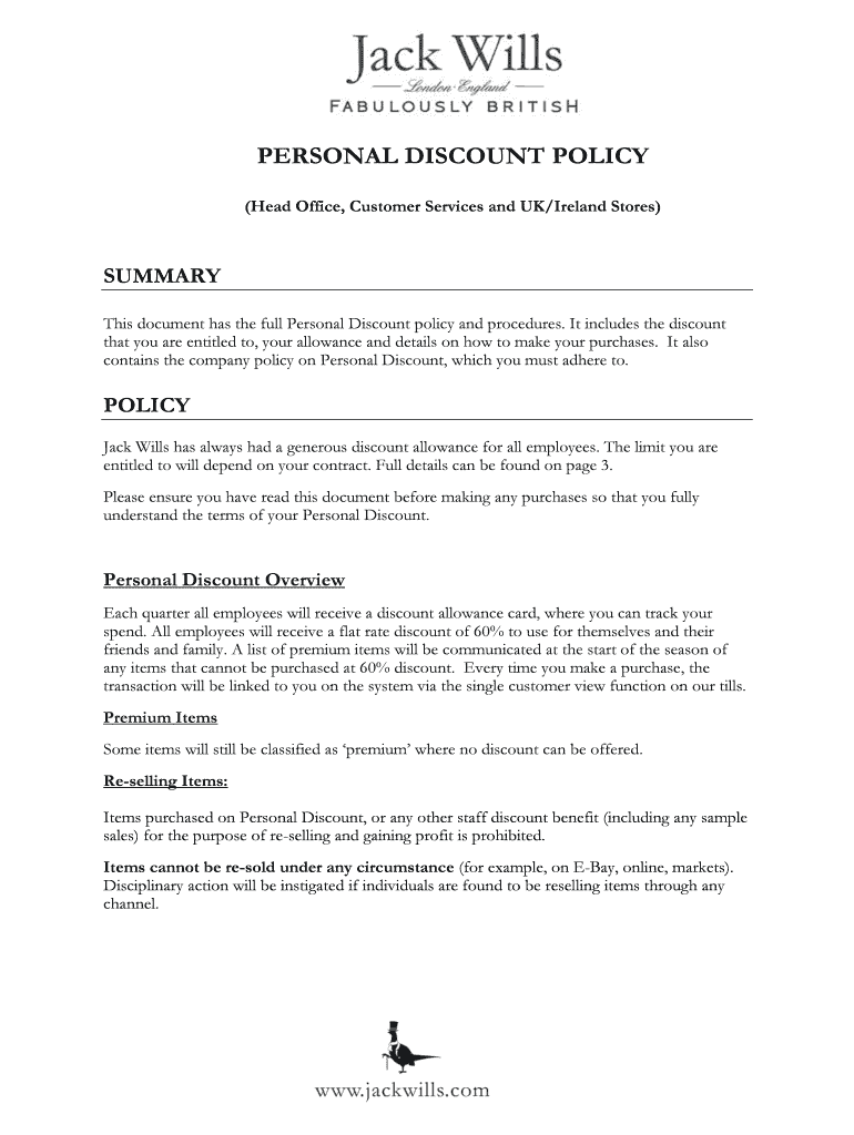 O Purchases can be made from any full price store in the UK Ireland. o ID must be provided before the transaction proceeds this should be either a Jack Wills ID card current pay slip obtainable through ADP Self Service or in exceptional circumstances a signed letter from HR. o Please be sensitive of the needs of the store do not make purchases during peak periods and acknowledge that customers come first. PERSONAL DISCOUNT POLICY Head Office Customer Services and UK/Ireland Stores SUMMARY...