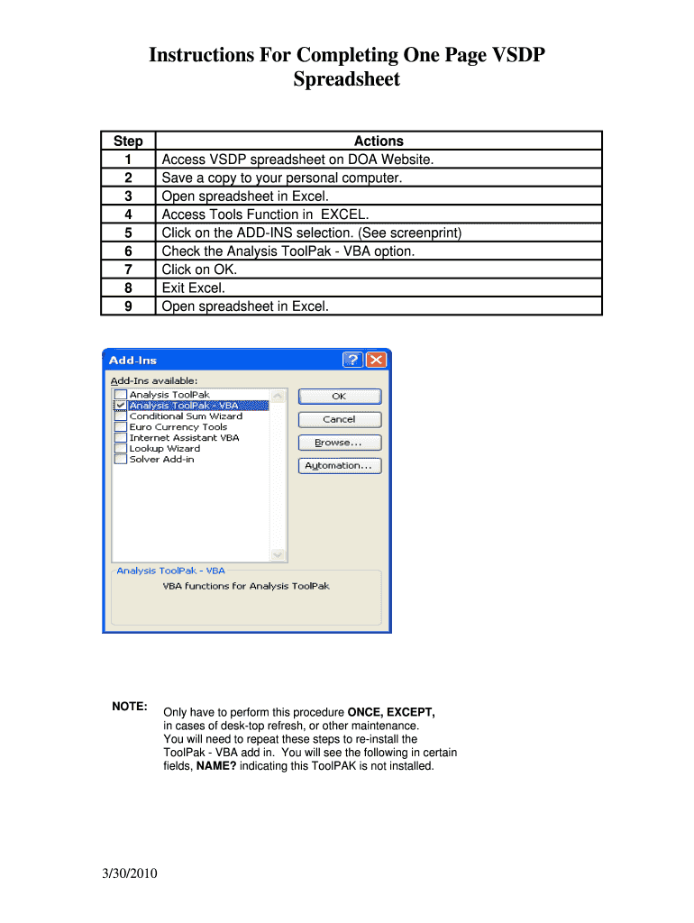 Instructions For Completing One Page VSDP Spreadsheet Step Actions Access VSDP spreadsheet on DOA Website. Save a copy to your personal computer. Open spreadsheet in Excel. Access Tools Function in EXCEL. Click on the ADD-INS selection. See screenprint Check the Analysis ToolPak - VBA option. Click on OK. Deduction Overrides Employee Deductions are automatically calculated and should be entered if a value is shown. Employer Retirement and Retiree Credit Deductions are LTD and Group Life...