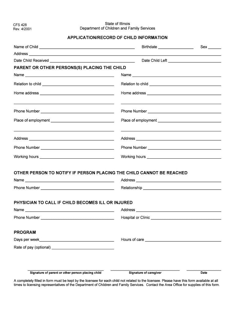 The Illinois Child Information Application Form, also known as the CFS 428 form, is a crucial document used for child care placements in Illinois. This form serves as a comprehensive tool for parents and guardians to provide essential information about a child being placed in care. Accurate completion of the CFS 428 form ensures that caregivers receive vital details necessary for the child’s health and well-being.