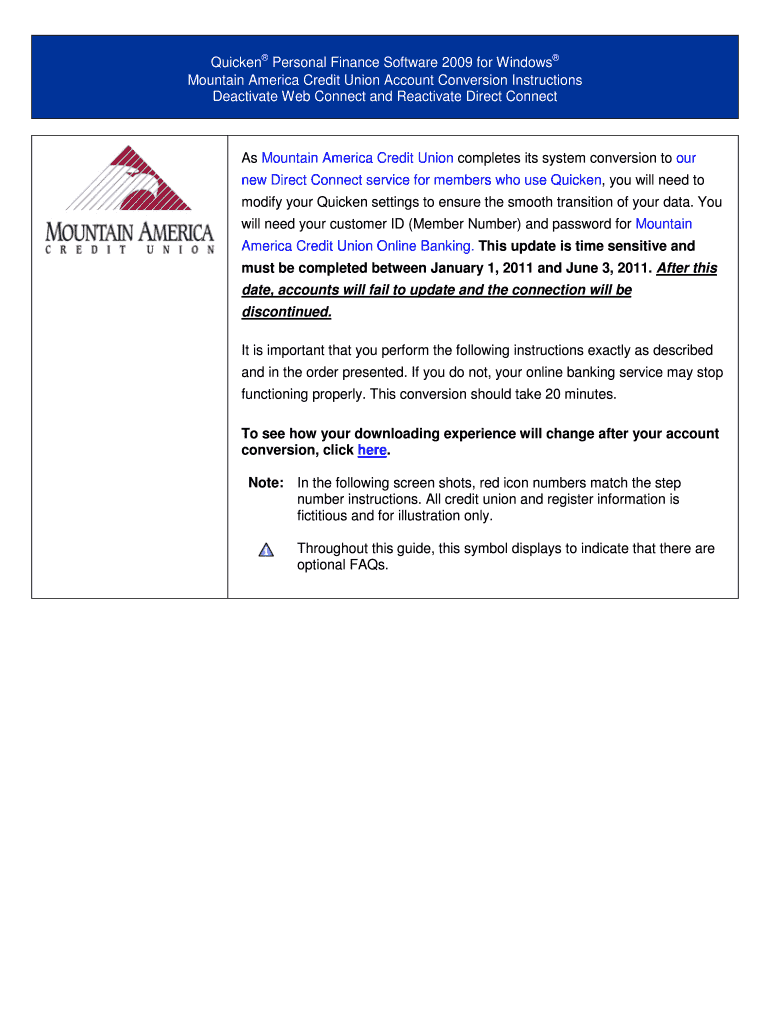 B. Click on Add Account button on the bottom left screen. c. On the Quicken Account Setup process window where Quicken prompts What is the financial institution for this account enter/select Mountain America CU Direct. DEACTIVATE YOUR ACCOUNTS for Quicken Windows 2007-2009 with OLD Mountain America Credit Union Direct Connect 1. It is recommended to save this file to your desktop so that you can find it easier. B. DOWNLOAD THE LATEST QUICKEN UPDATE 1. A member service representative will...