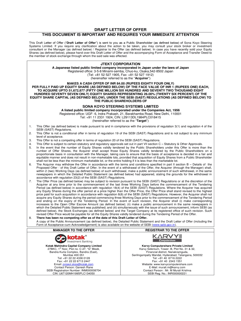 This Draft Letter of Offer (Draft Letter of Offer) is sent to you as a Public Shareholder (as defined below)
