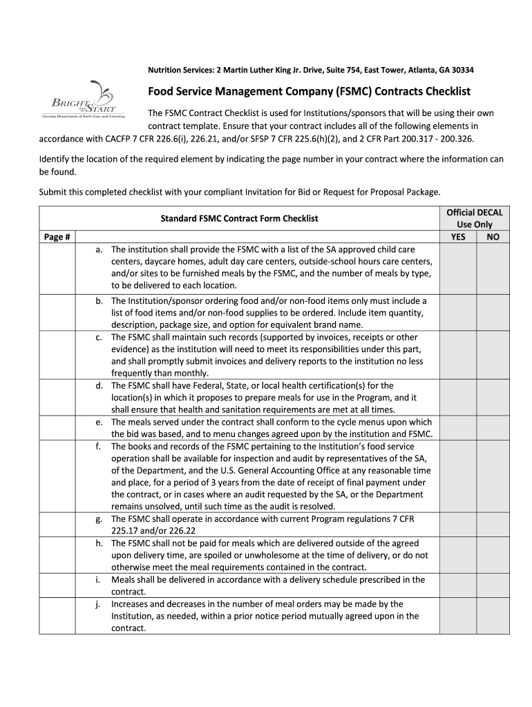 CFR 225. 15 m 5-7 Appendix II of 2 CFR 200. 326 renewals. Full contract term including renewals shall not exceed five 5 years. Nutrition Services 2 Martin Luther King Jr. Drive Suite 754 East Tower Atlanta GA 30334 Food Service Management Company FSMC Contracts Checklist The FSMC Contract Checklist is used for Institutions/sponsors that will be using their own contract template. All meals served under the Program shall meet the requirements of 7 CFR 226. 20 and/or 225. 16. l. All breakfasts...