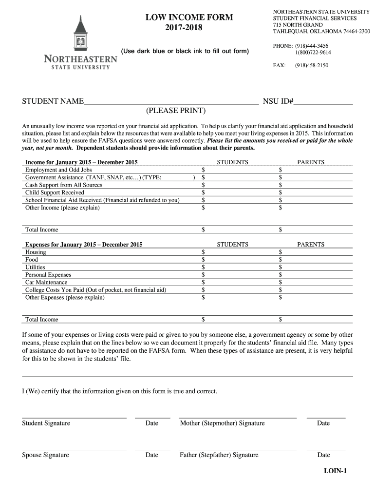 I We certify that the information given on this form is true and correct. Student Signature Date Mother Stepmother Signature Spouse Signature Father Stepfather Signature LOIN-1. NORTHEASTERN STATE UNIVERSITY STUDENT FINANCIAL SERVICES 715 NORTH GRAND TAHLEQUAH OKLAHOMA 74464-2300 LOW INCOME FORM 2017-2018 PHONE 918 444-3456 1 800 722-9614 Use dark blue or black ink to fill out form FAX STUDENT NAME 918 458-2150 NSU ID PLEASE PRINT An unusually low income was reported on your financial aid...
