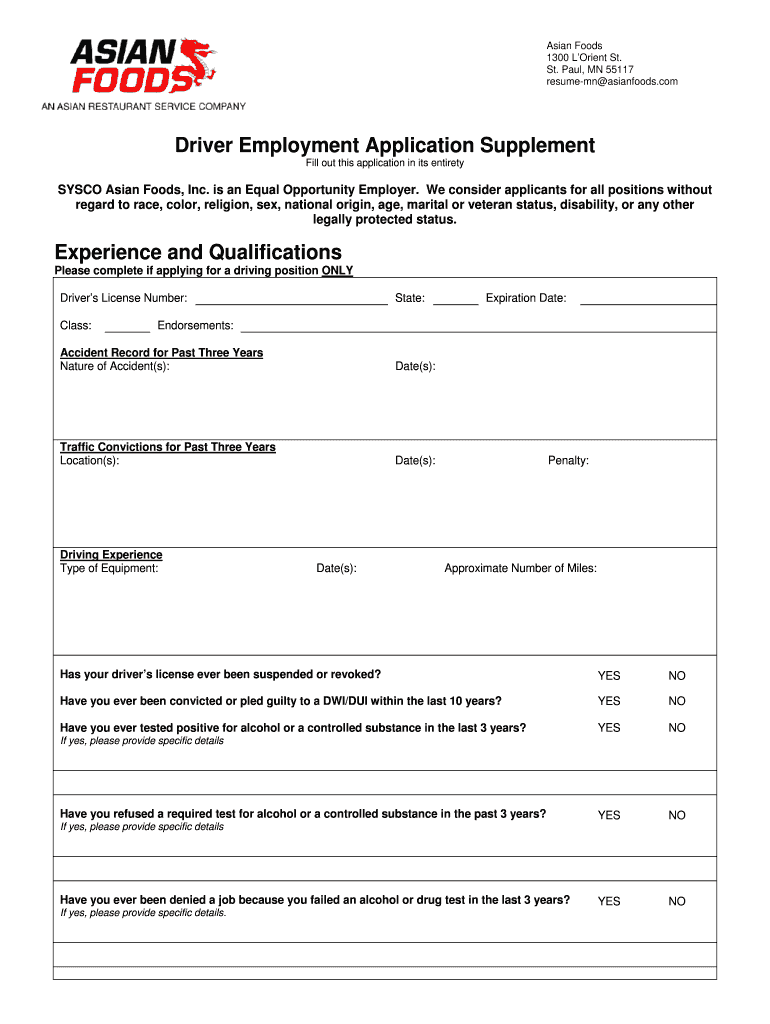Asian Foods 1300 L Orient St. St. Paul MN 55117 resume-mn asianfoods. com Driver Employment Application Supplement Fill out this application in its entirety SYSCO Asian Foods Inc. is an Equal Opportunity Employer. Experience and Qualifications Please complete if applying for a driving position ONLY Driver s License Number Class State Expiration Date Endorsements Accident Record for Past Three Years Nature of Accident s Date s Traffic Convictions for Past Three Years Location s Driving...