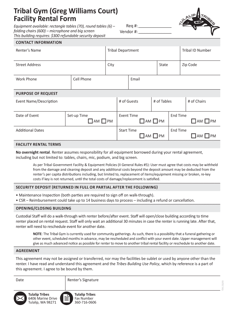 I agree to be bound by them. Renter s Signature Tulalip Tribes 6406 Marine Drive Tulalip WA 98271 Fax Number 360-716-0606 TDS-23250 Date Clear Form Print Form Email Form MUST HAVE BOTH PARTIES SIGNATURES AREA Restrooms DESCRIPTION PASS FAIL NOTES Trash Sweep Sinks Counters Locker Rooms Hallways Lobby 1 Bleachers Gym 1 Exterior Entryway WALK-THROUGH BEFORE DATE AFTER Custodial Signature. CSR Reimbursement could take up to 14 business days to process including a refund or cancellation....