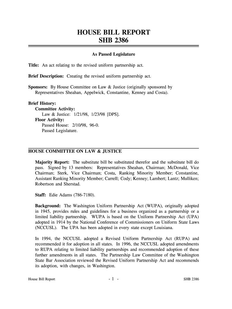 Signed by 13 members Representatives Sheahan Chairman McDonald Vice Chairman Sterk Vice Chairman Costa Ranking Minority Member Constantine Assistant Ranking Minority Member Carrell Cody Kenney Lambert Lantz Mulliken Robertson and Sherstad. Staff Edie Adams 786-7180. Testimony Against None. Testified Bruce Benson and Brian Todd Washington State Bar Association pro. The UPA has been adopted in every state except Louisiana. In 1994 the NCCUSL adopted a Revised Uniform Partnership Act RUPA and...