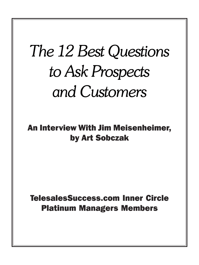 The 12 Best Questions to Ask Prospects and Customers An Interview With Jim Meisenheimer by Art Sobczak TelesalesSuccess. That is finding out about that person personally because some of those motivators may be stronger than even some of their business motivators. I m Art Sobczak. On this program I m thrilled to be speaking with Jim Meisenheimer who s going to tell us the 12 Best Questions to Ask Customers. Art Well what you re doing is preempting the price objection. Jim Ever since I started...