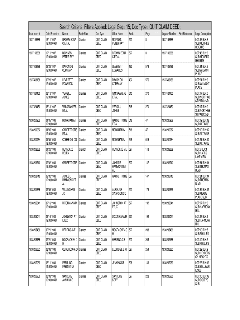 Get the free Search Criteria Filters Applied: Legal Seq 15; Doc Type QUIT CLAIM DEED;