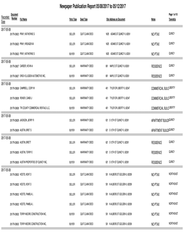 Newpaper Publication Report 05/08/2017 to 05/12/2017 Recorded Date Document Number Notes Page 1 of 10 Township ADAMS ST QUINCY IL 62301 NO PTAX QUINCY QUIT CLAIM DEED SELLER WARRANTY DEED MAPLE ST QUINCY IL 62301 RESIDENCE BUYER 2017R-03628 CAMPBELL CORY W TYLER DR LIBERTY IL 62347 LIBERTY COMMERCIAL BUILDING 2017R-03628 RENIER CANDI J 2017R-03629 JACKSON JERRY R 621 S 12TH ST QUINCY IL 62301 APARTMENT BUILDING 2017R-03629 AUSTIN BRET S 2017R-03632 HOOTS KENT D 501 N ALBERS ST GOLDEN IL 62339...