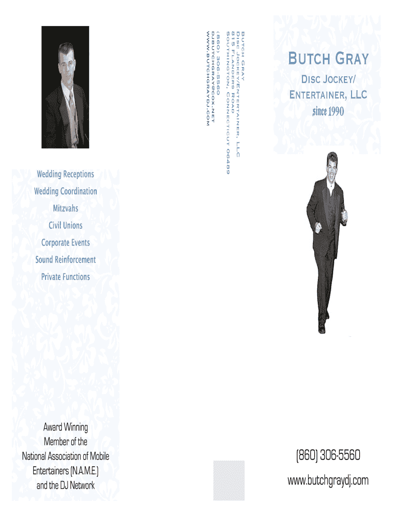 Butch Gray Disc Jockey/Entertainer LLC 815 Flanders Road Southington Connecticut 06489 860 306-5560 djbutchgray cox. Net www. butchgraydj. com Wedding Receptions Entertainer LLC since 1990 Wedding Coordination Mitzvahs Civil Unions Corporate Events Sound Reinforcement Private Functions Award Winning Member of the National Association of Mobile Entertainers N.A. Special dedications may be made and if you have someone that is musically inclined we can incorporate them in the festivities. Patty...
