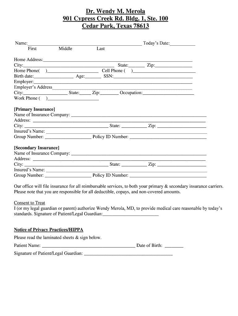 Dr. Wendy M. Merola 901 Cypress Creek Rd. Bldg. 1 Ste. 100 Cedar Park Texas 78613 Name Today s Date First Middle Last Home Address City State Zip Home Phone Cell Phone Birth date Age SSN Employer Employer s Address Work Phone Primary Insurance Name of Insurance Company Address Insured s Name Group Number Policy ID Number Secondary Insurance Our office will file insurance for all reimbursable services to both your primary secondary insurance carriers. Please note that you are responsible for...