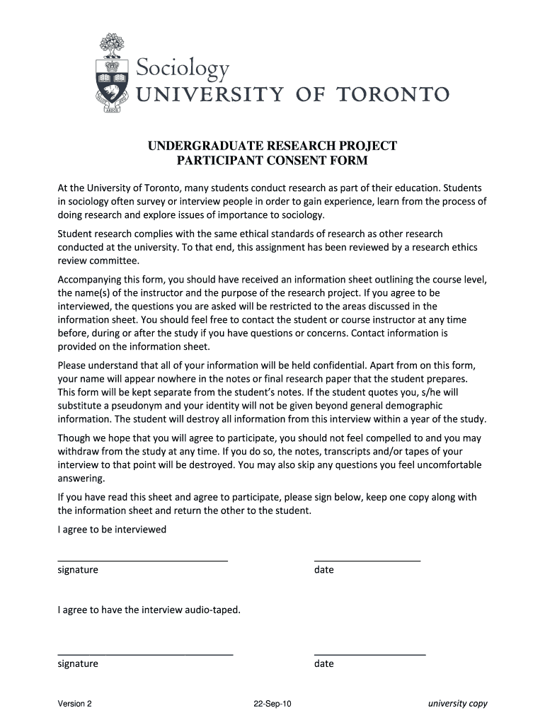 I agree to be interviewed signature date I agree to have the interview audio-taped. Version 2 22-Sep-10 university copy participant copy. UNDERGRADUATE RESEARCH PROJECT PARTICIPANT CONSENT FORM At the University of Toronto many students conduct research as part of their education. Students in sociology often survey or interview people in order to gain experience learn from the process of doing research and explore issues of importance to sociology. This form will be kept separate from the...