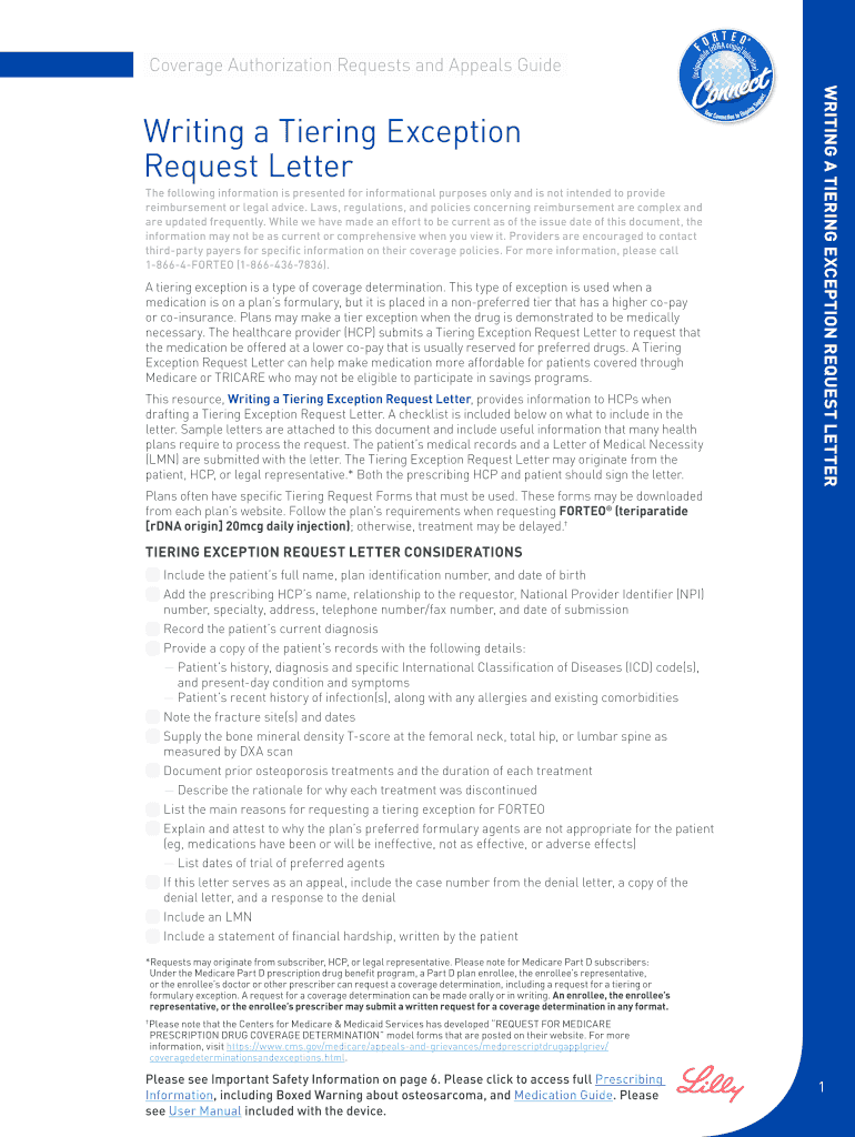Zip. Accessed January 26 2017. 2. package insert. Indianapolis IN Eli Lilly and Company 2017. An enrollee the enrollee s representative or the enrollee s prescriber may submit a written request for a coverage determination in any format. The request is for teriparatide rDNA origin 20mcg daily injection which is medically appropriate and necessary for this patient who has been diagnosed with osteoporosis at high risk for fracture ICD code s. An enrollee the enrollee s representative or the...