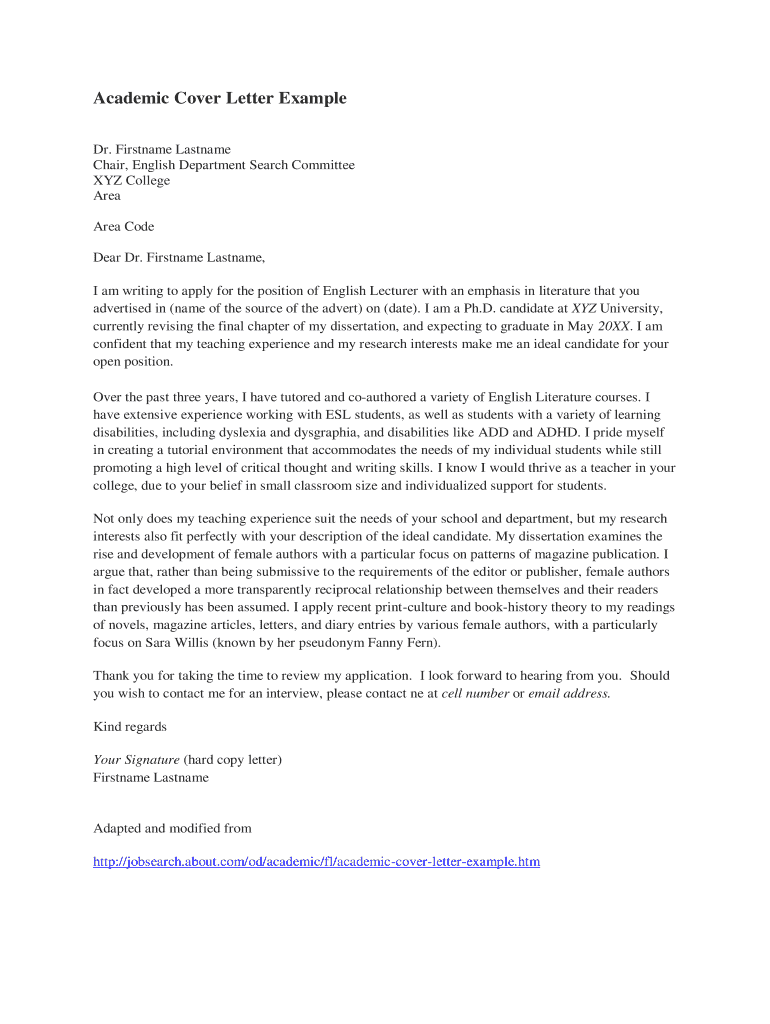 Kind regards Your Signature hard copy letter Firstname Lastname Adapted and modified from http //jobsearch. Firstname Lastname I am writing to apply for the position of English Lecturer with an emphasis in literature that you advertised in name of the source of the advert on date. I have extensive experience working with ESL students as well as students with a variety of learning disabilities including dyslexia and dysgraphia and disabilities like ADD and ADHD. Academic Cover Letter Example...