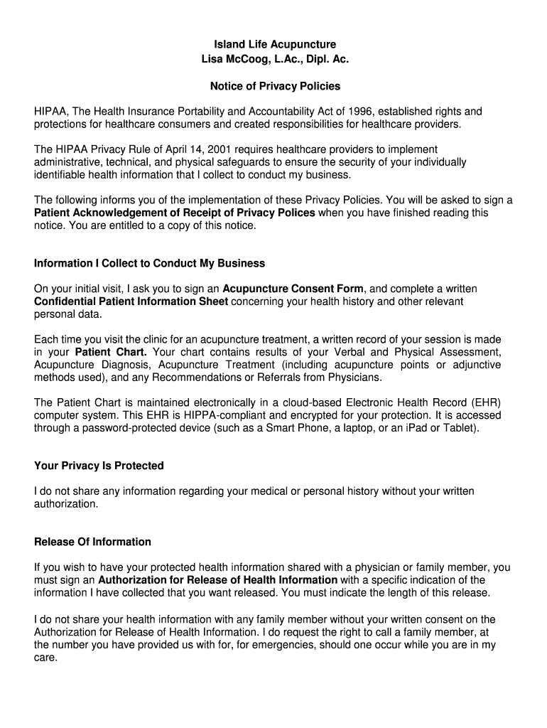 Island Life Acupuncture Lisa McCoog L.Ac. Dipl. Ac. Notice of Privacy Policies HIPAA The Health Insurance Portability and Accountability Act of 1996 established rights and protections for healthcare consumers and created responsibilities for healthcare providers. The HIPAA Privacy Rule of April 14 2001 requires healthcare providers to implement administrative technical and physical safeguards to ensure the security of your individually identifiable health information that I collect to conduct...