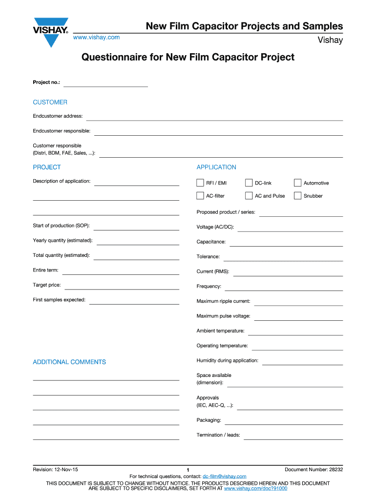 New Film Capacitor Projects and Samples www. vishay. com Vishay Questionnaire for New Film Capacitor Project Project no. Packaging Termination / leads Revision 12-Nov-15 Document Number 28232 For technical questions contact dc-film vishay. CUSTOMER Endcustomer address Endcustomer responsible Customer responsible Distri BDM FAE Sales. PROJECT Description of application APPLICATION RFI / EMI DC-link Automotive AC-filter AC and Pulse Snubber Proposed product / series Start of production SOP...