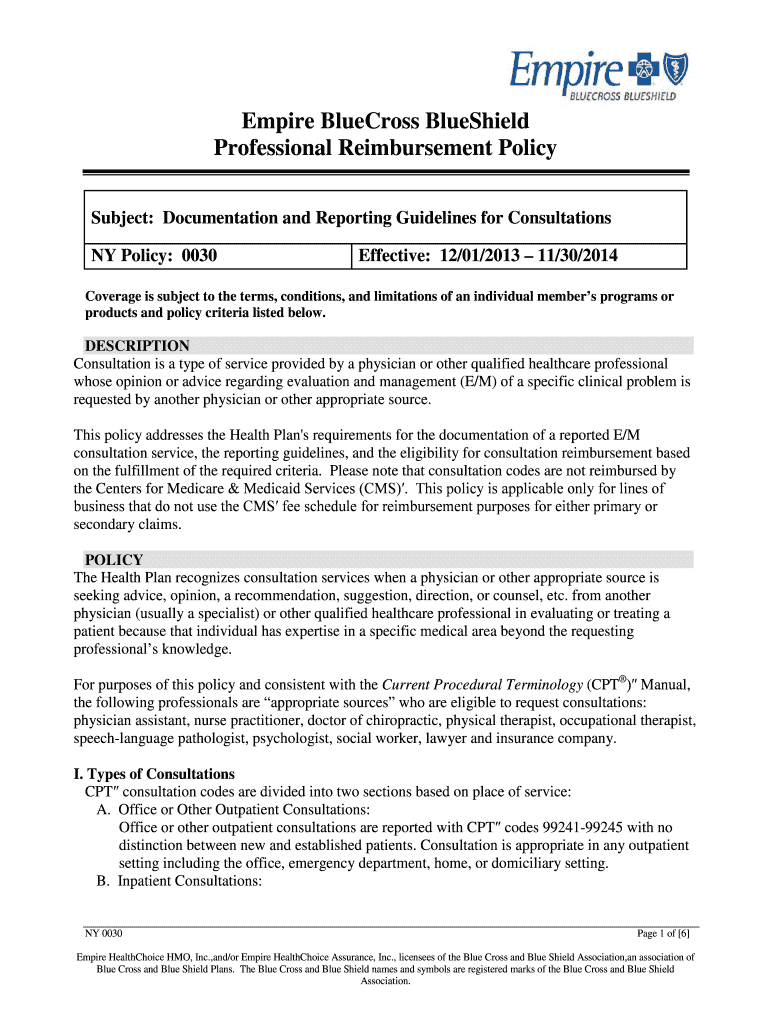 B. Inpatient Consultations NY 0030 Page 1 of 6 Empire HealthChoice HMO Inc. and/or Empire HealthChoice Assurance Inc. licensees of the Blue Cross and Blue Shield Association an association of Blue Cross and Blue Shield Plans. POLICY HISTORY 09/01/2009 02/02/2010 06/07/2011 06/05/2012 06/04/2013 Adopted by Enterprise Professional Revised Reviewed Annual Review with Revisions Current Procedural Terminology CPT 2013 Professional Edition pg. No part of this publication may be reproduced stored in...