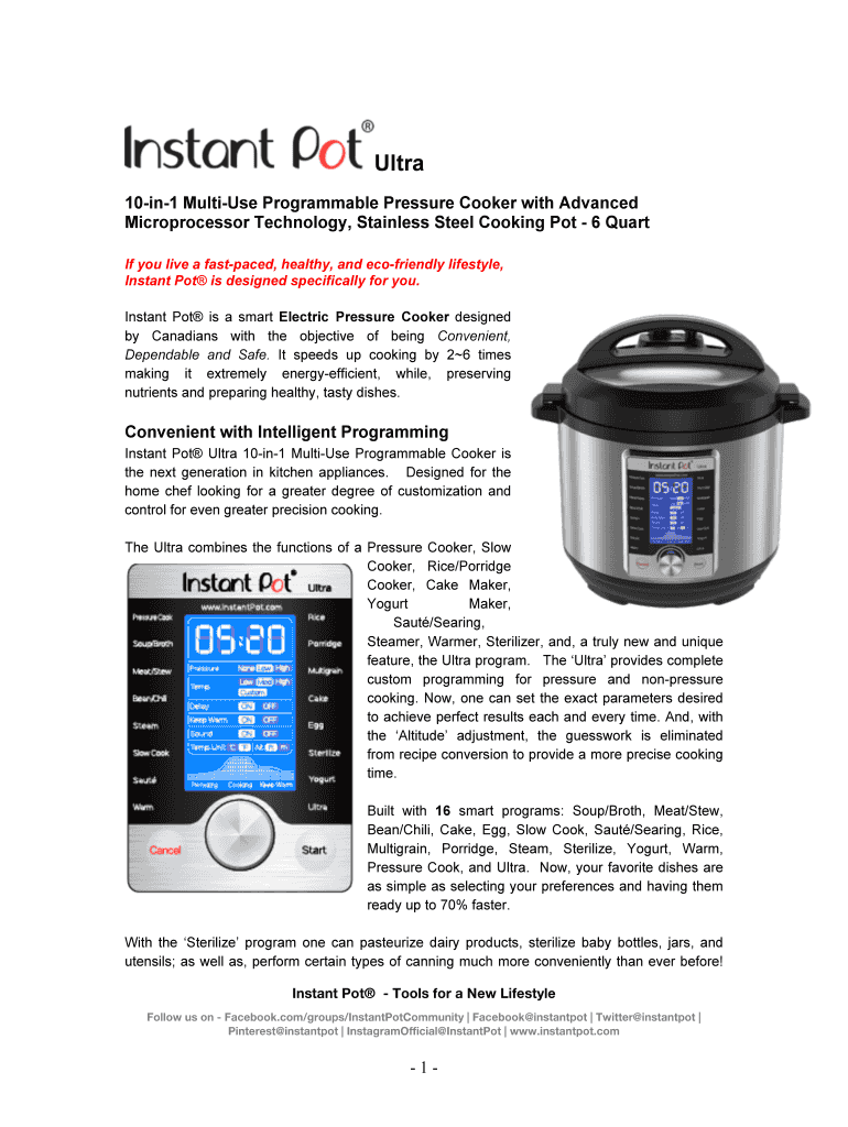 Com/groups/InstantPotCommunity Facebook instantpot Twitter instantpot Pinterest instantpot InstagramOfficial InstantPot www. 23psi 105kpa 2. Safety Lid Lock prevents accidental opening of the cooker while it is pressurized 3. Designed for the home chef looking for a greater degree of customization and control for even greater precision cooking. With the Sterilize program one can pasteurize dairy products sterilize baby bottles jars and utensils as well as perform certain types of canning much...