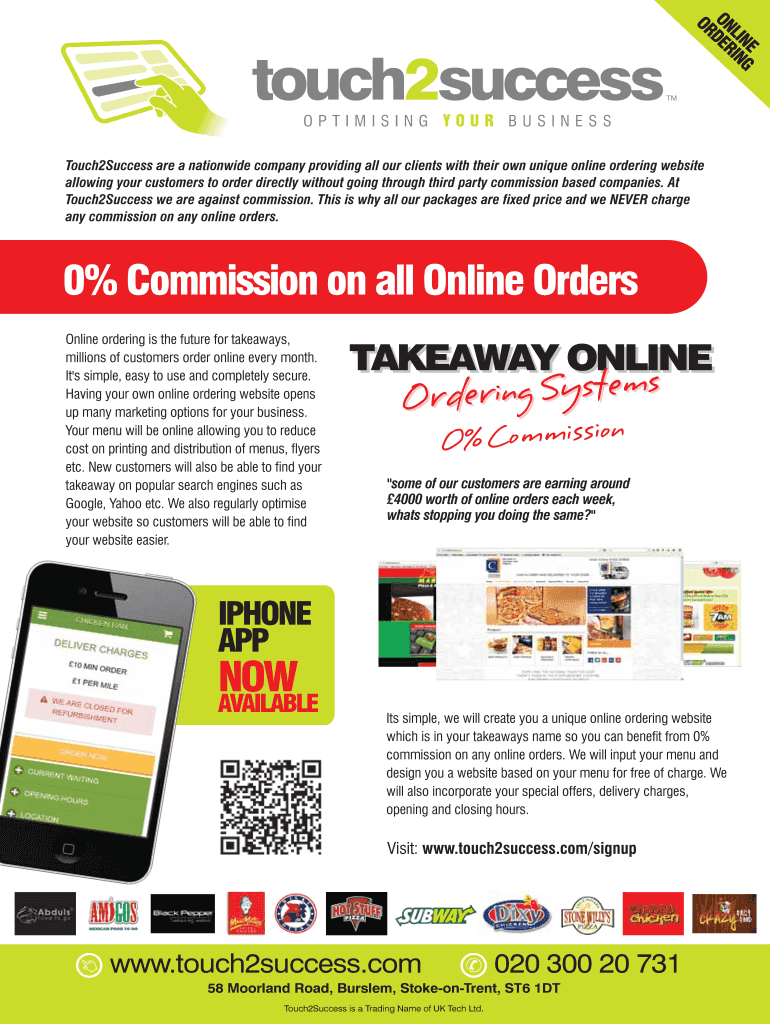 Visit www. touch2success. com/signup www. touch2success. com 020 300 20 731 58 Moorland Road Burslem Stoke-on-Trent ST6 1DT Card Payments iPhone App Take card transactions online and over the phone. Why can I not buy a Touch2Success Simply you can t buy what we provide. There are many factors supporting this some of which are Website Domain Costs and annual renewals Sms Subscription Costs Website Hosting cost 150 per year as we have to use a very reliable one Regular Security Updates Customer...