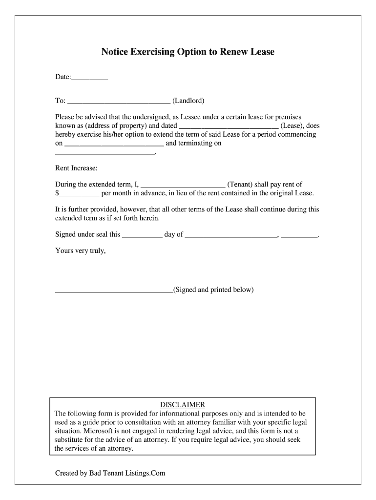 Yours very truly DISCLAIMER The following form is provided for informational purposes only and is intended to be used as a guide prior to consultation with an attorney familiar with your specific legal situation. Microsoft is not engaged in rendering legal advice and this form is not a substitute for the advice of an attorney. Notice Exercising Option to Renew Lease Date To Landlord Please be advised that the undersigned as Lessee under a certain lease for premises known as address of...