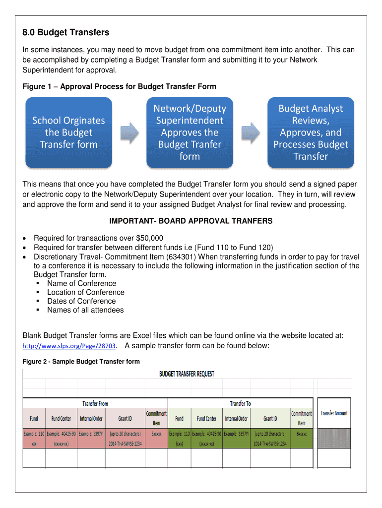 Slps. org/Page/28703. A sample transfer form can be found below Figure 2 - Sample Budget Transfer form. 8. 0 Budget Transfers In some instances you may need to move budget from one commitment item into another. This can be accomplished by completing a Budget Transfer form and submitting it to your Network Superintendent for approval. Figure 1 Approval Process for Budget Transfer Form Network/Deputy Approves the Budget Tranfer form School Orginates the Budget Transfer form Budget Analyst...