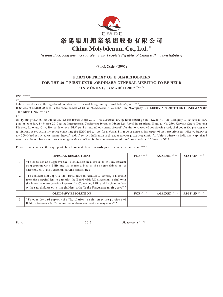 20 each in the share capital of China Molybdenum Co. Ltd. the Company HEREBY APPOINT THE CHAIRMAN OF THE MEETING Note 4 or as my/our proxy ies to attend and act for me/us at the 2017 first extraordinary general meeting the EGM of the Company to be held at 1 00 p.m. on Monday 13 March 2017 at the International Conference Room of Mudu-Lee Royal International Hotel at No. 239 Kaiyuan Street Luolong District Luoyang City Henan Province PRC and at any adjournment thereof for the purposes of...