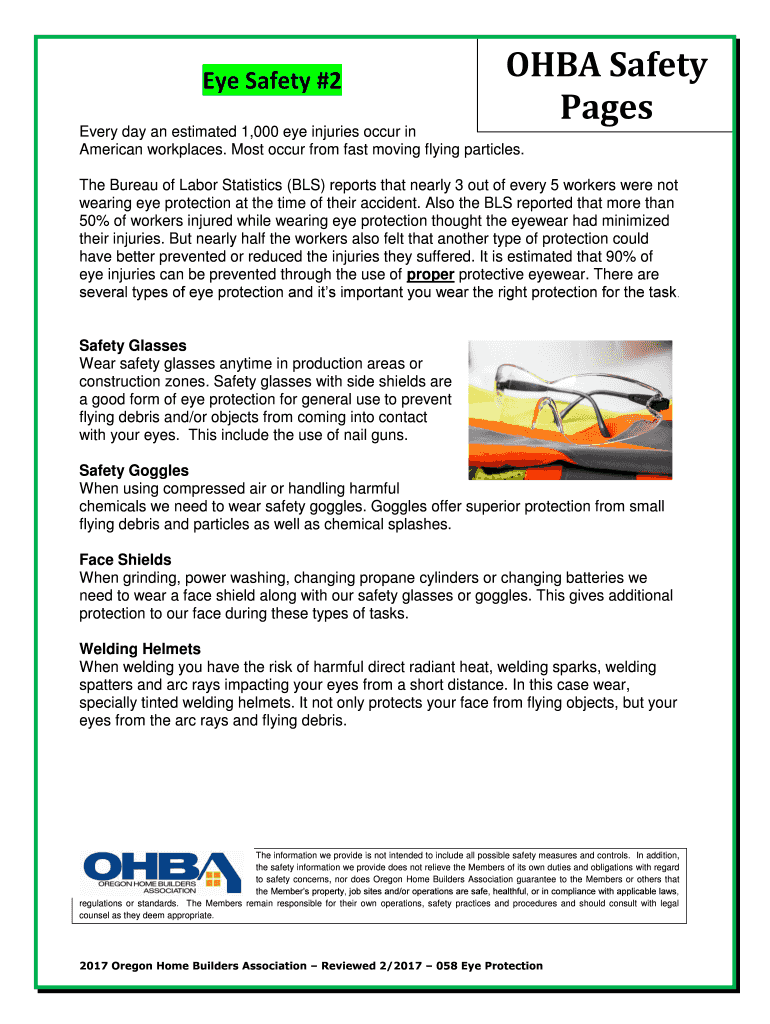 This gives additional protection to our face during these types of tasks. Welding Helmets When welding you have the risk of harmful direct radiant heat welding sparks welding spatters and arc rays impacting your eyes from a short distance. Also the BLS reported that more than 50 of workers injured while wearing eye protection thought the eyewear had minimized their injuries. Eye Safety 2 OHBA Safety Pages Every day an estimated 1 000 eye injuries occur in American workplaces. This include the...