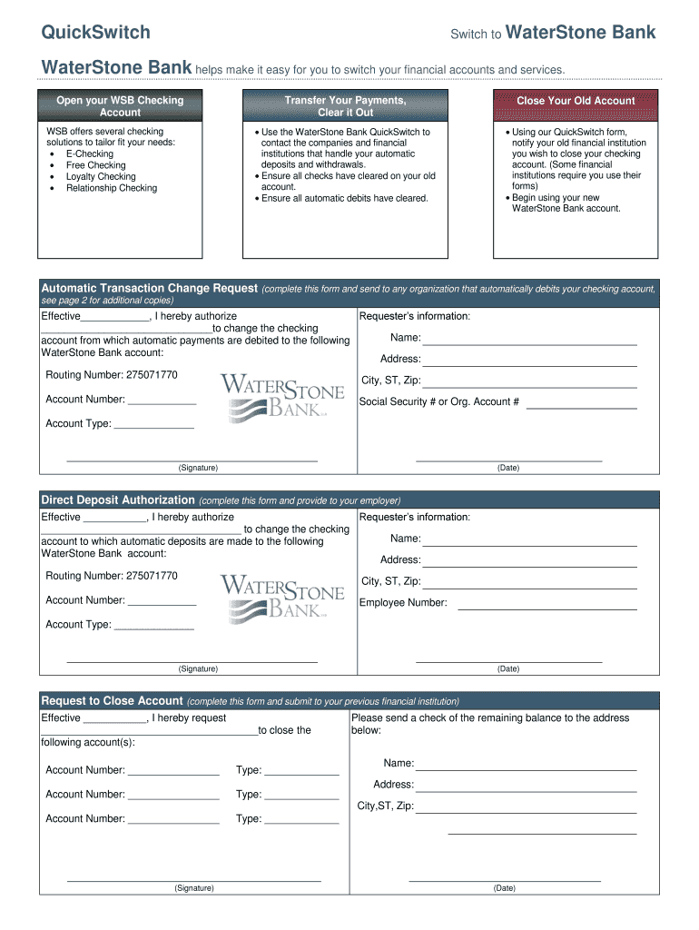 Any current account holders looking to transfer their banking services to WaterStone Bank can use the QuickSwitch Form. This includes individuals setting up direct deposits and managing their automatic transactions.