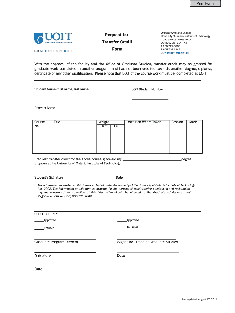 Print Form Request for Transfer Credit Form Office of Graduate Studies University of Ontario Institute of Technology 2000 Since Street North Oshawa, ON L1H 7K4 T 905.721.8668 F 905.721.3242 www.gradstudies.uoit.ca