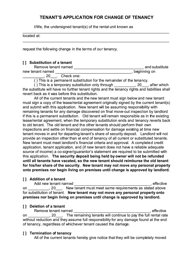 TENANTS APPLICATION FOR CHANGE OF TENANCY I/We, the undersigned tenant(s) of the rental unit known as located at: request the following change in the terms of our tenancy. Substitution of a tenant