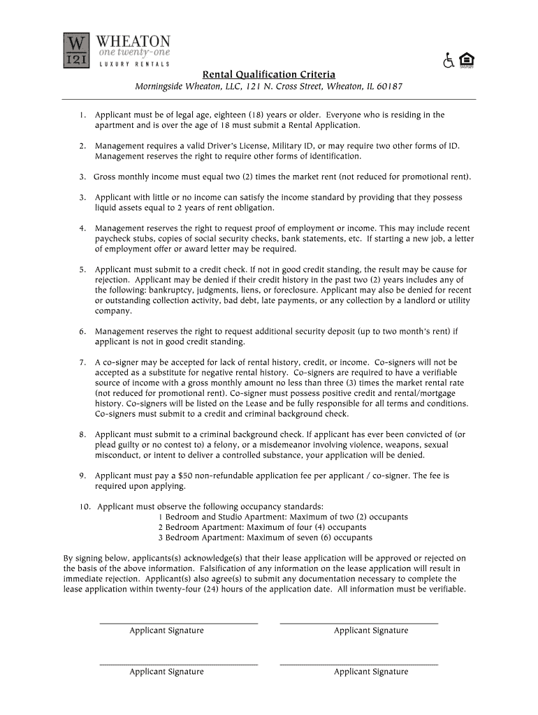 Rental Qualification Criteria Morning side Wheaton, LLC, 121 N. Cross Street, Wheaton, IL 60187 1. Applicant must be of legal age, eighteen (18) years or older. Everyone who is residing in the apartment