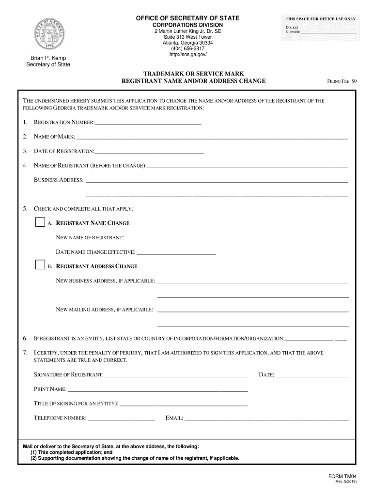 Sign date print the signer s name and enter the title of the signer if applicable. Enter the signer s email address and phone number. Submit supporting documentation showing the change of name of the registrant. b. Registrant Address Change Enter the new business address of registrant and/or the new mailing address of the registrant. Line 6. If registrant is an entity enter the state or country of incorporation/formation/organization. Line 7. INSTRUCTIONS FORM TM04 NOTE This form Form TM04...