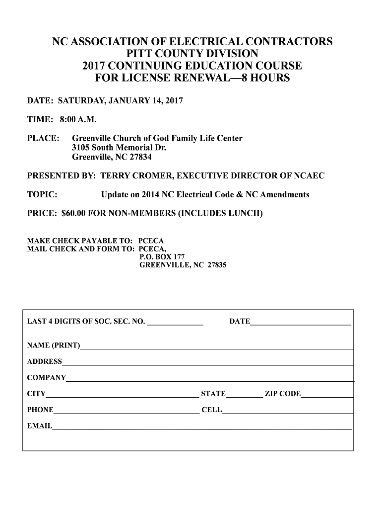 00 FOR NON-MEMBERS INCLUDES LUNCH MAKE CHECK PAYABLE TO PCECA MAIL CHECK AND FORM TO PCECA P. O. BOX 177 GREENVILLE NC 27835 LAST 4 DIGITS OF SOC. M. PLACE Greenville Church of God Family Life Center 3105 South Memorial Dr. Greenville NC 27834 PRESENTED BY TERRY CROMER EXECUTIVE DIRECTOR OF NCAEC TOPIC Update on 2014 NC Electrical Code NC Amendments PRICE 60. NC ASSOCIATION OF ELECTRICAL CONTRACTORS PITT COUNTY DIVISION 2017 CONTINUING EDUCATION COURSE FOR LICENSE RENEWAL 8 HOURS DATE...