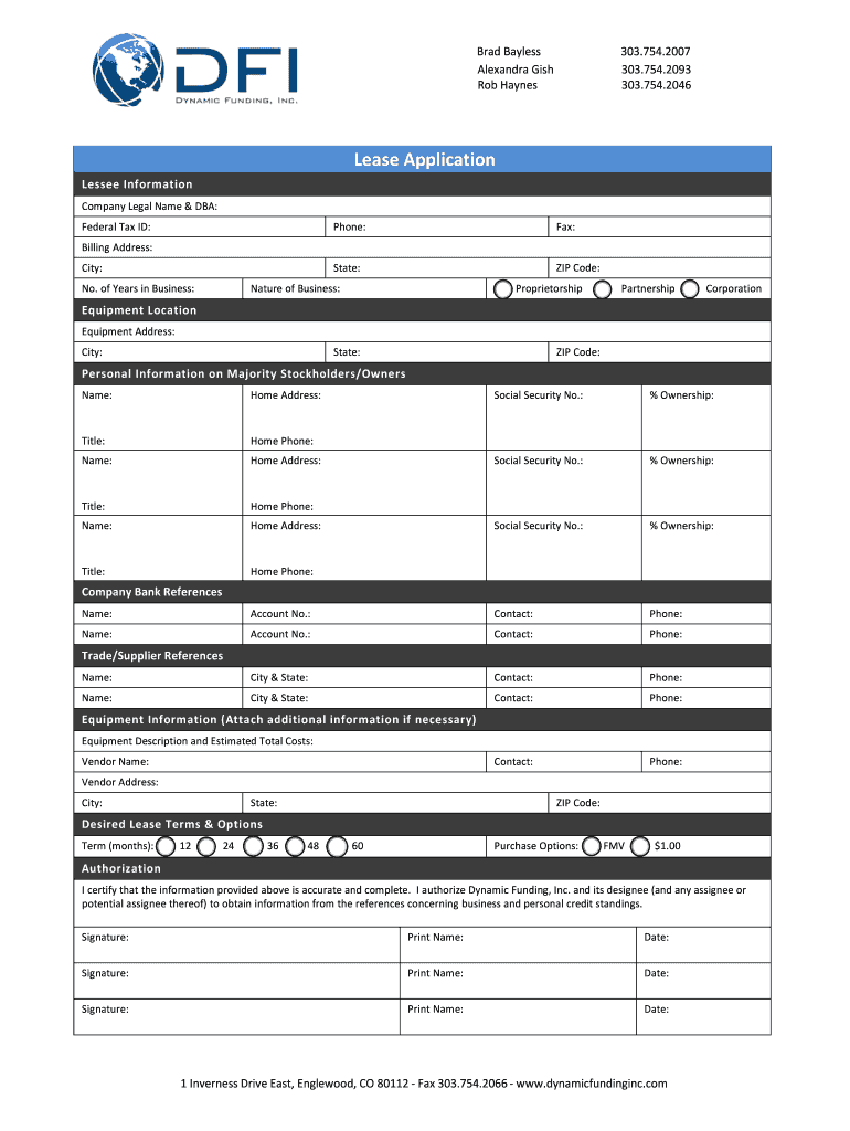 754. 2007 Lease Application Lessee Inf or mat io n Company Legal Name DBA Federal Tax ID Phone Fax State ZIP Code Billing Address City No. of Years in Business Nature of Business Proprietorship Partnership Corporation E qui pme nt L oc ati on Equipment Address Pe r sona l Inf or mat io n o n M aj or ity Sto ckh ol de r s/O wne r s Name Home Address Title Home Phone Social Security No. Ownership Company Bank References Account No. Contact City State Trade/Supplier References E qui pme nt Inf...