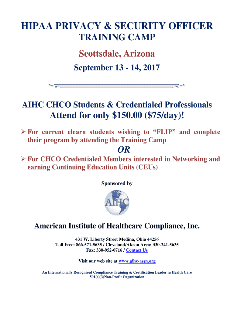 HIPAA PRIVACY SECURITY OFFICER TRAINING CAMP Scottsdale Arizona September 13 - 14 2017 AIHC CHCO Students Credentialed Professionals Attend for only 150. Aihc-assn.org Click on OR copy and paste the following link http //www. aihc-assn.org/CertificationsCourses/ProductPages-ShoppingCart/HIPAAPrivacySecurityTrainingCamp-Refresher. Aihc-assn.org An Internationally Recognized Compliance Training Certification Leader in Health Care 501 c 3 Non-Profit Organization Training Camp Facilitator Joanne...