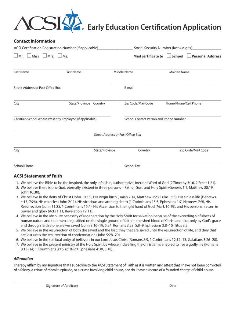 The Early Education Certification Application is a form used by individuals seeking certification in early education through ACSI to demonstrate their qualifications and commitment.