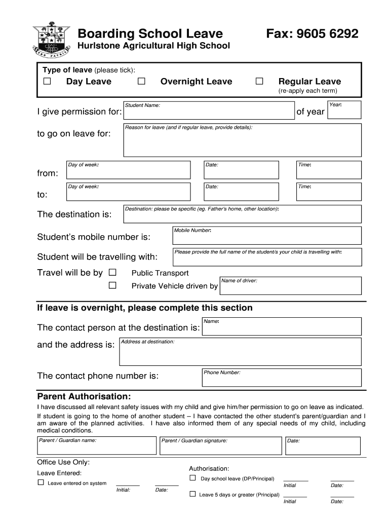 Boarding School Leave Fax 9605 6292 Hurlstone Agricultural High School Type of leave please tick Day Leave Overnight Leave Regular Leave re-apply each term Year Student Name I give permission for of year Reason for leave and if regular leave provide details to go on leave for Day of week Date Time from to Destination please be specific eg. I have also informed them of any special needs of my child including medical conditions. Parent / Guardian name Office Use Only Authorisation Leave Entered...