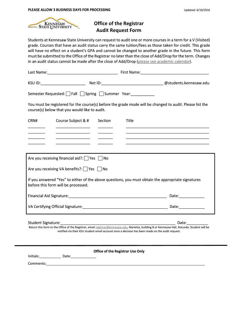 Edu Marietta building B or Kennesaw Hall Rotunda. Student will be notified via their KSU student email account once a decision has been made on the audit request. PLEASE ALLOW 3 BUSINESS DAYS FOR PROCESSING Updated 6/10/2016 Office of the Registrar Audit Request Form Students at Kennesaw State University can request to audit one or more courses in a term for a V Visited grade. Last Name First Name KSU ID Net ID students. kennesaw. edu Semester Requested Fall Spring Summer Year You...